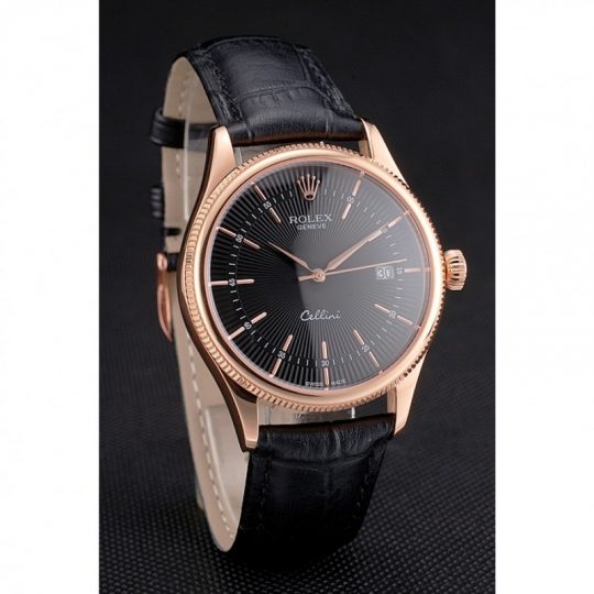 Replica Rolex Cellini Date Black Dial Rose Gold Markings Rose Gold Case Black Leather Strap